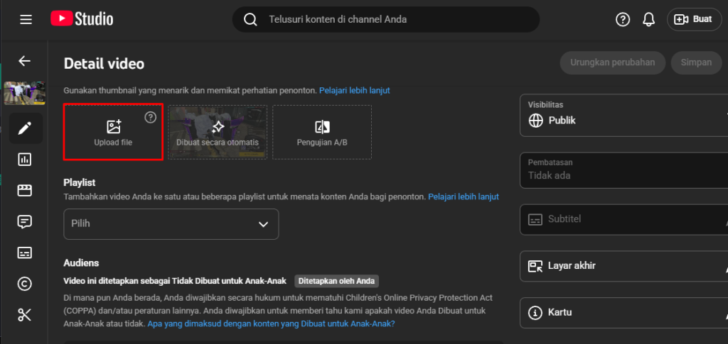 - Klik Upload Thumbnail (letaknya di sebelah kiri opsi otomatis) untuk mengunggah gambar custom kamu.